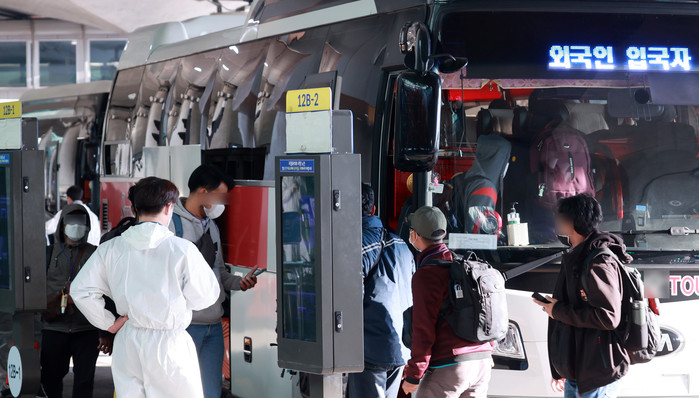 6일 오전 인천국제공항 제1여객터미널에서 외국인 입국자들이 격리시설로 가기 위해 버스에 오르고 있다.