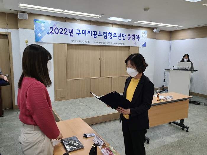 | ▲꿈드림 청소년단으로 선발된 한 청소년이 임명장을 받고 있는 모습. (사진제공=구미시청) |