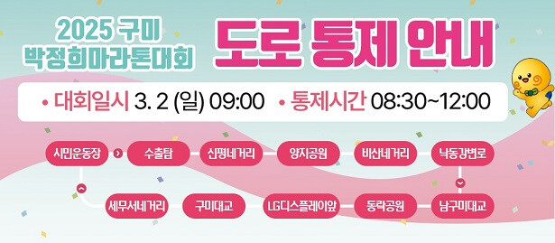 대회 당일 오전 8시 30분부터 12시까지 「구미시민운동장-수출탑-양지공원-비산네거리-낙동강변로-남구미대교-동락공원-LG디스플레이앞-구미대교-세무서네거리-시민운동장」 구간의 교통이 통제된다.