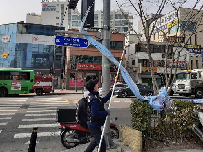 | ▲ 불법 현수막을 정비하고 있는 모습. (사진=성동구청 제공) |