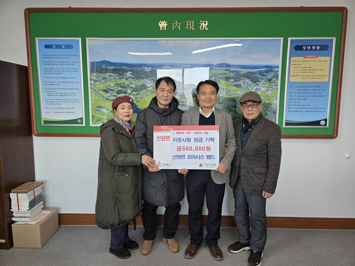 이정실 선원면장은 “지역사회 복지 향상을 위한 나눔 실천에 감사드리며, 면에서도 더욱 세심하게 어려운 이웃을 살피고 따뜻한 지역 공동체를 만드는 데에 앞장서겠다”고 말했다.