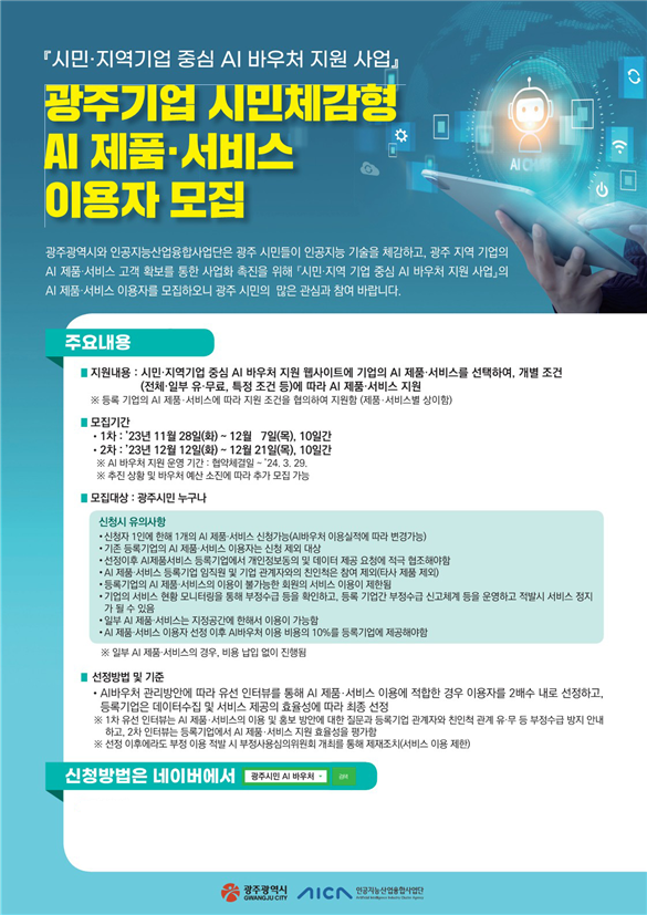 광주광역시의 ‘시민ᆞ지역기업 중심 AI 바우처 지원사업’은 시민의 최신 인공지능 기술 체험과 함께 지역 기업의 AI 제품 홍보 및 서비스 고객 확보를 통한 사업화 촉진을 위해 마련되었다. 참여자들은 관련 비용의 일부를 바우처로 지원받아 광주지역의 스타트업과 중소기업이 보유하고 있는 AI 제품과 서비스를 이용할 수 있다.