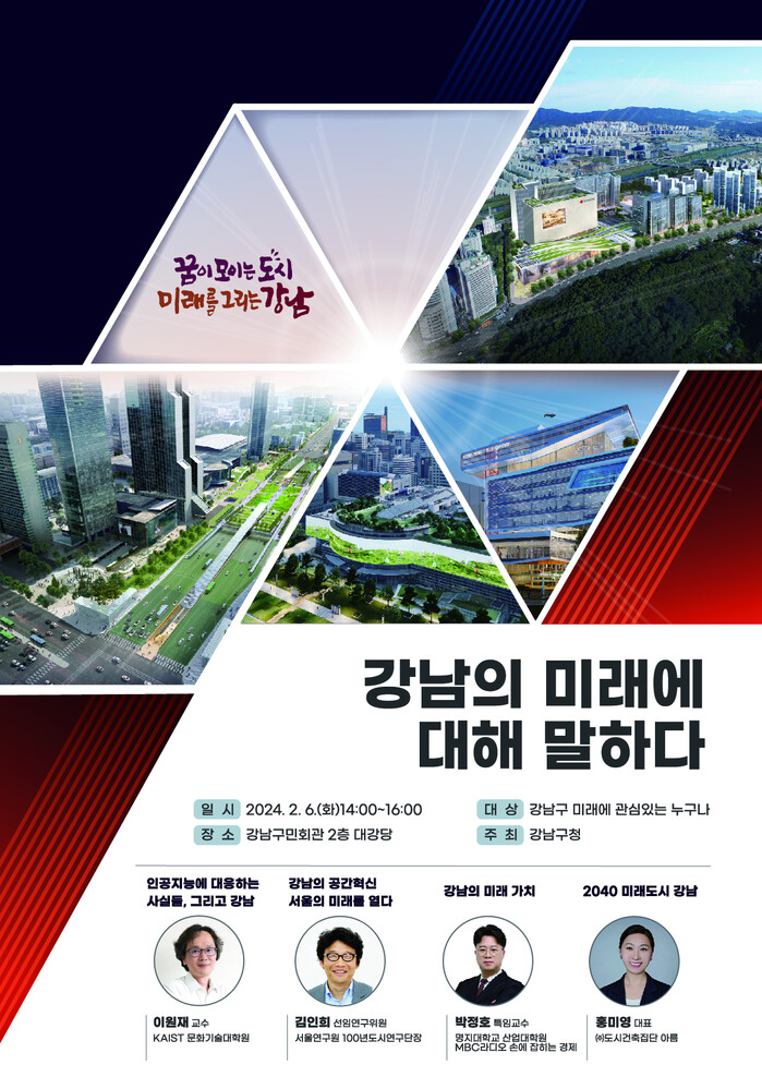 이어 ▲박정호 명지대학교 산업대학원 특임교수가 ‘강남의 미래 가치’를 전망하고, ▲용역 총괄계획가인 홍미영 (주)도시건축집단 아름 대표가 ‘2040 미래도시 강남’에 대해 발표한다.