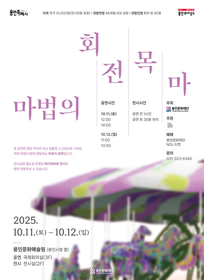 [용인=오왕석 기자] (재)용인문화재단(이사장 이상일)은 오는 10월 11일과 12일, 용인문화예술원 국제회의실에서 특별한 몰입형 공연 〈마법의 회전목마〉를 선보인다. 티켓은 9월 19일부터 용인문화재단과 NOL티켓에서 예매 가능하며, 용인문화재단의 티켓 할인 이벤트 ‘만원 조아용’ 적용 공연으로 전석 1만원에 판매된다.