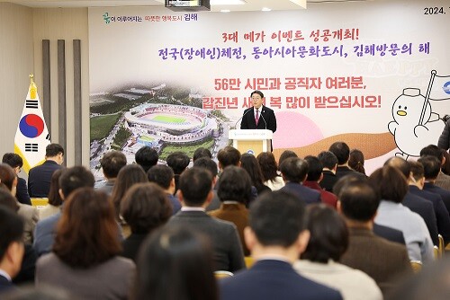 이날 시무식은 식전공연(김해시립합창단), 청렴결의 낭독, 시상(모범공무원 및 우수공무원 표창 12명, 우수기관 표창 2개 부서), 신년사 순으로 진행됐다.
