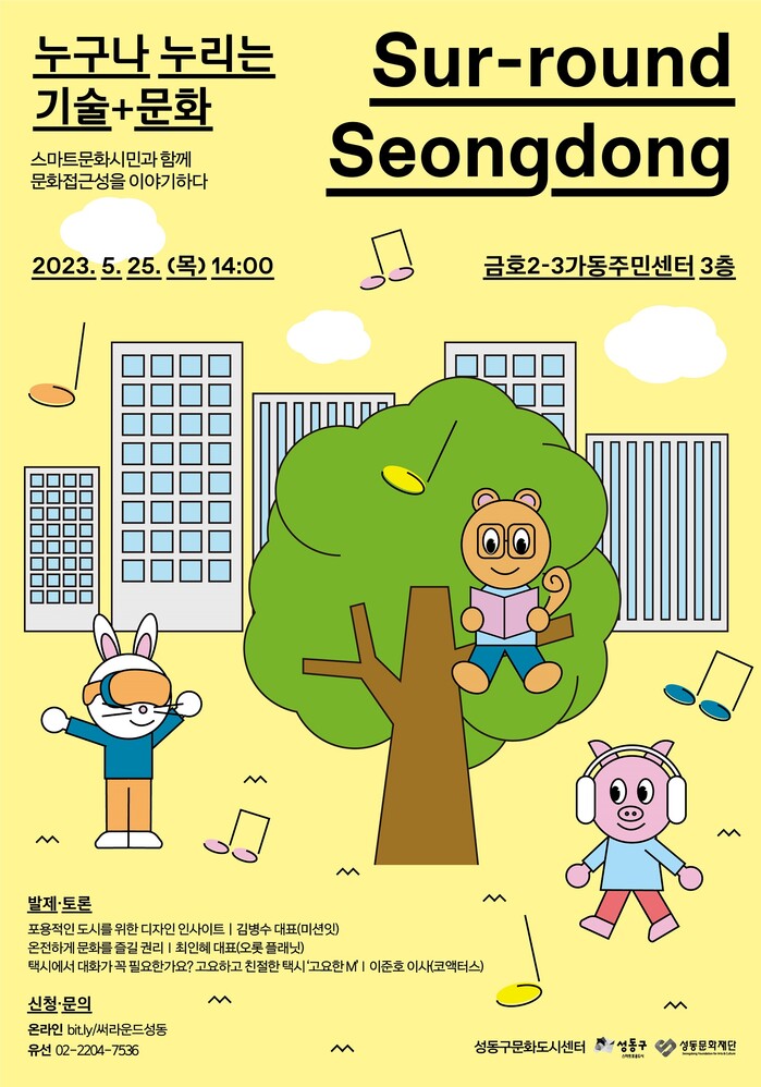 ‘스마트문화도시 성동’과 문화접근성 향상에 이야기 나누고 싶은 주민이라면 누구나 참여 가능하며 자세한 사항은 성동구문화도시센터로 문의하면 된다.
