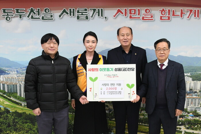 경기 동두천시 국제라이온스협회 354-H지구 무궁화라이온스클럽은 5일 설맞이 취약계층 노인들을 위한 연탄 2000장을 기부했다. 이번 기부는 서울화외과의원의 후원으로 이뤄졌다. 사진은 전달식에서 박형덕 시장(오른쪽 두 번째)과 관계자들이 기념촬영을 하고 있는 모습. (사진=동두천시청 제공)