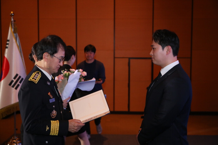 | 인천세종병원 김경빈 주임(오른쪽)이 김승룡 소방청장 직무대행으로부터 대상(행정안전부장관상)을 수여 받고 있다.(사진=인천세종병원) |
