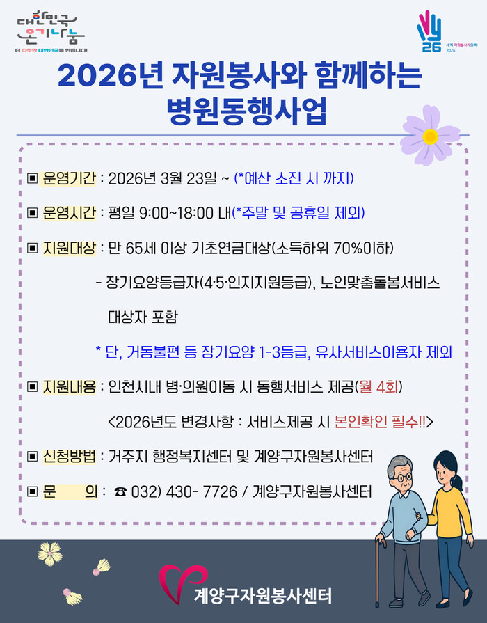 [인천=문찬식 기자] 인천 계양구자원봉사센터(센터장 홍순석)는 3월 23일부터 ‘2026년 자원봉사와 함께하는 병원동행사업’을 실시한다고 밝혔다.