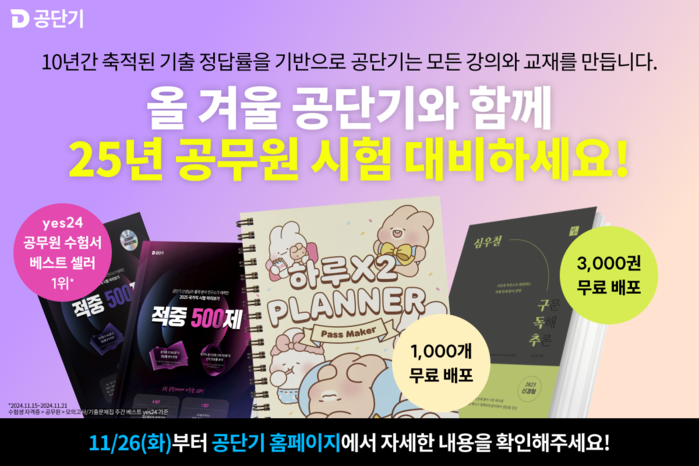 [시민일보 = 여영준 기자] 에스티유니타스의 공무원 시험 전문 브랜드 ‘공단기’는 공시생들의 학습 효율을 높이는 다양한 도구와 교육 자료를 제공하는 겨울 프로모션을 진행한다고 26일 밝혔다.