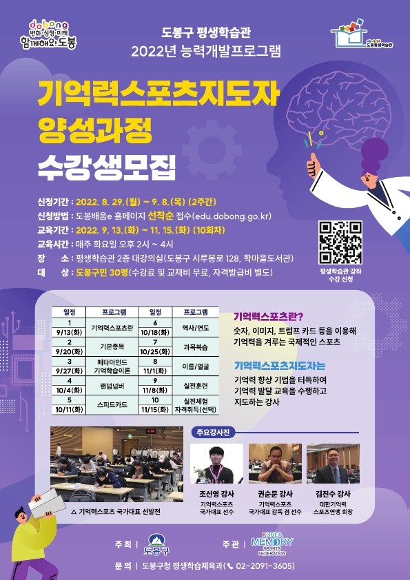 | ▲ 기억력스포츠지도자 양성과정 수강생 모집 홍보 포스터. (사진제공=도봉구청) |