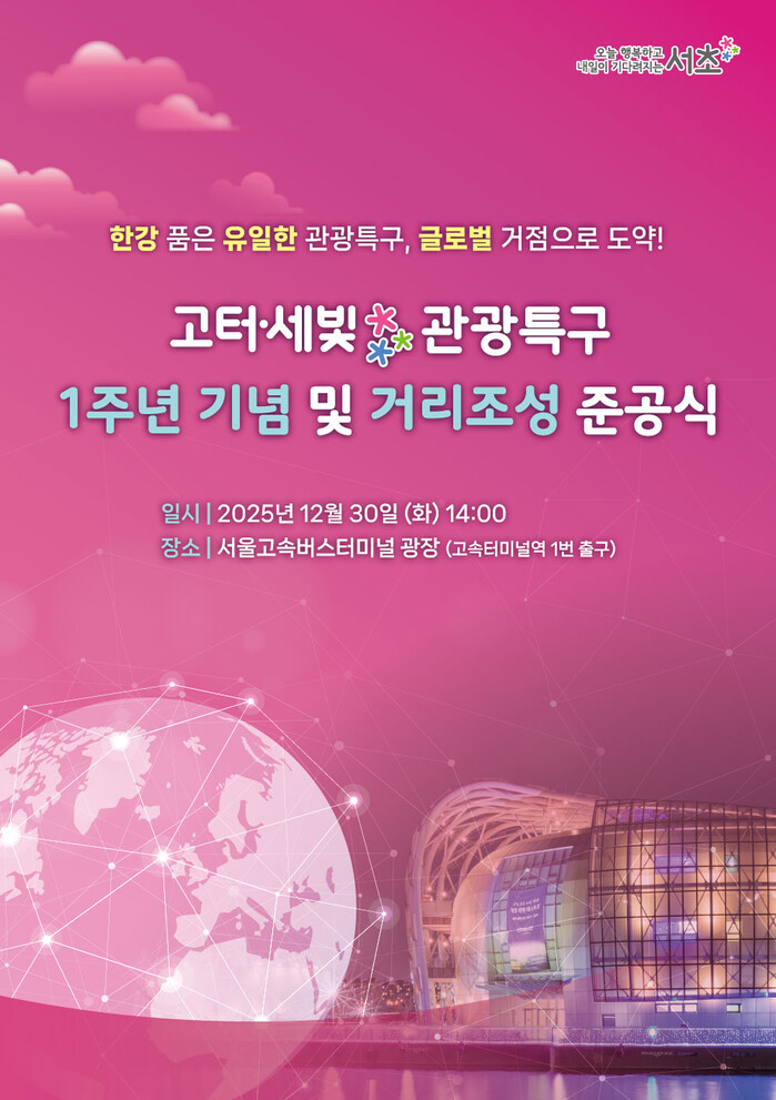 [시민일보 = 박소진 기자] 서초구(구청장 전성수)는 고터·세빛 관광특구 지정 1주년을 맞아 오는 30일 14시 서울고속터미널 광장 일대에서 관광특구의 본격적인 도약을 알리는 「고터·세빛 관광특구 1주년 기념 및 거리조성 준공식」을 개최한다고 밝혔다.