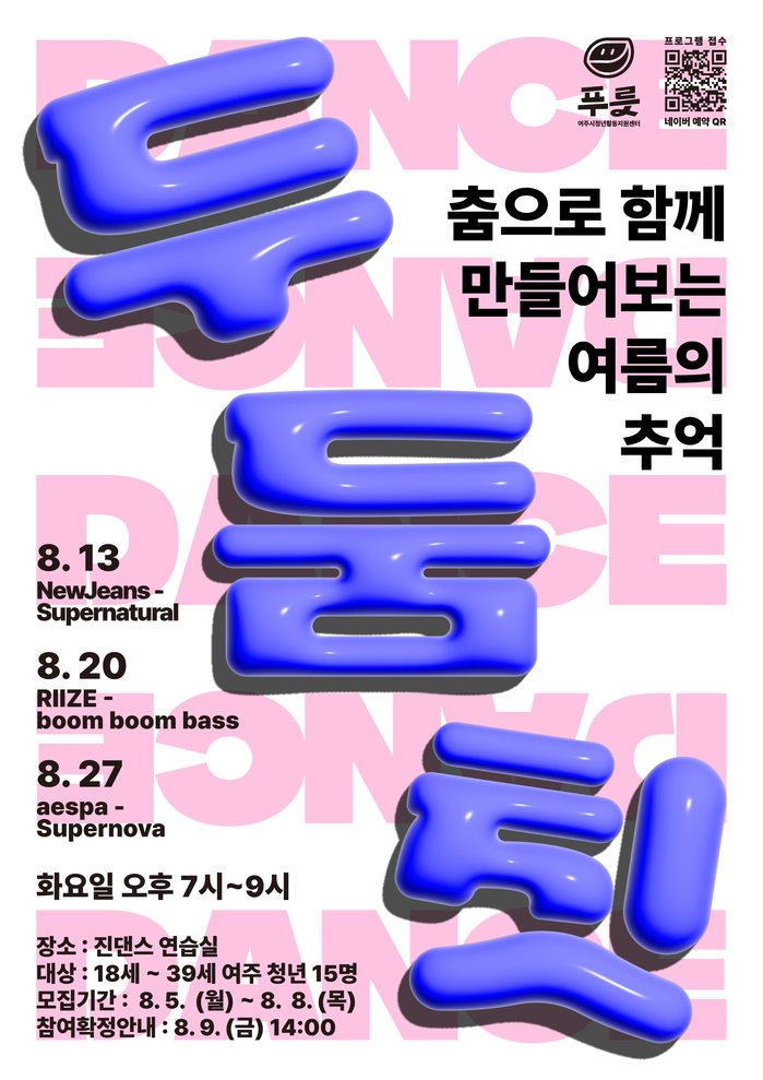 청년들 사이에서 큰 인기를 끌고 있는 숏폼 컨텐츠를 활용한 ▲릴스용 댄스배우기(8월13일) ▲남자아이돌 댄스배우기(8월20일) ▲여자아이돌 댄스배우기(8월27일) 등 여름을 맞아 청년들에게 인기가 많은 아이돌 그룹들의 댄스를 마스터 해볼 수 있는 시간으로 진행될 예정이다.