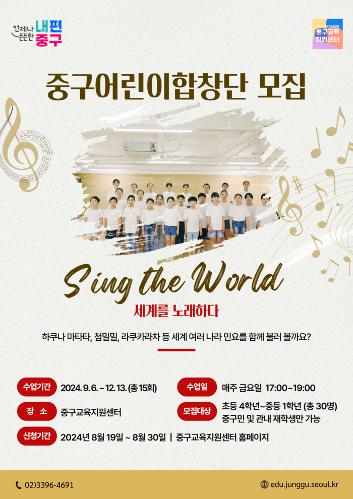 중구교육지원센터는 합창 단원 30명을 뽑아 오는 9월부터 연말까지 매주 금요일 합창 수업을 15회 진행한다. 이번 시즌에는 하쿠나마타타, 첨밀밀, 라쿠카라차 등 세계 여러 나라 민요를 배울 예정이다.