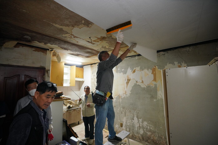 8일 두 번째로 진행된 봉사활동에는 비가 세차게 내리는 상황 속에서도 비닐로 비를 막고 도배와 장판을 교체하고 전기 배전함 및 수도, 화장실 등을 수리했다.
