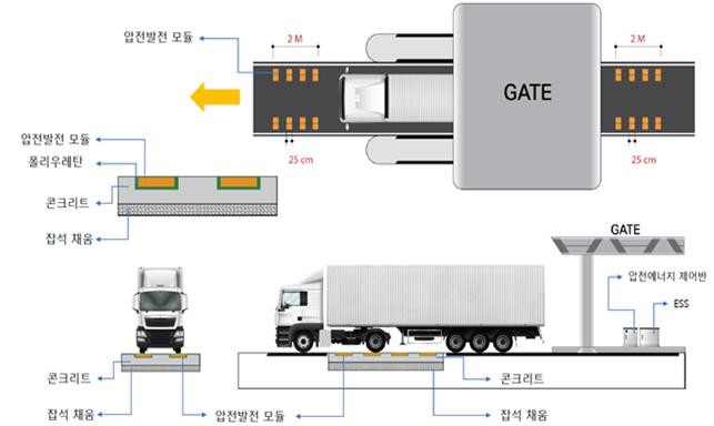 이 사업은 물체의 무게를 이용하여 전력을 생산하는 압전발전 시스템 기술을 개발하는 것으로, 항만 게이트에 압전소자모듈을 설치하여 컨테이너 차량이 출입하면서 발생시키는 압력과 진동을 전기에너지로 변환하는 기술이 핵심이다.