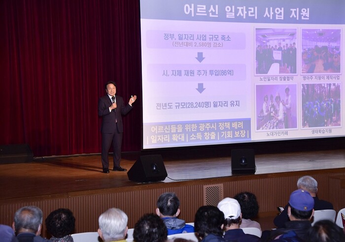 강 시장은 인공지능(AI) 2단계 사업, 미래차 국가산단 신규 지정 등 광주시 주요 현안을 소개하고, 4월 새롭게 시작한 ‘광주다움 통합돌봄’을 어르신들이 손쉽게 이용할 수 있도록 세심한 설명을 덧붙였다.