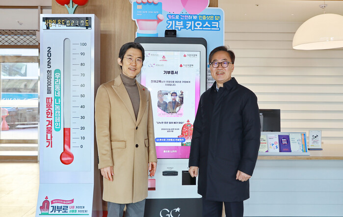 | ▲ 따뜻한 겨울나기 성품 전달식에서 유성훈 구청장(오른쪽)과 ㈜천재교육 최정민 회장이 기념사진을 찍고 있다. (사진=금천구청 제공) |