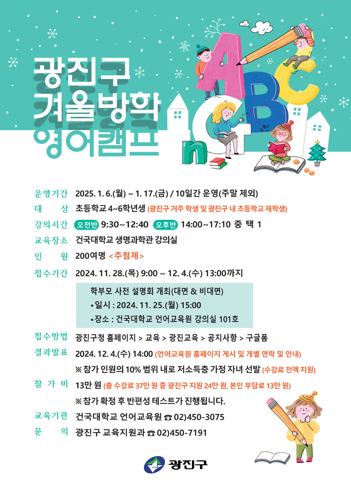 [시민일보 = 여영준 기자] 광진구(구청장 김경호)가 내년 1월, 지역 내 초등학교 4~6학년을 대상으로 ‘초등학생 겨울방학 영어캠프’를 운영한다.