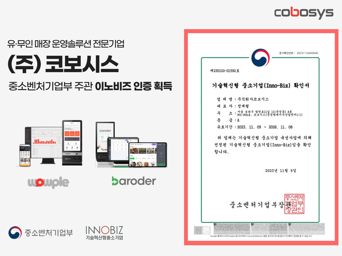 유·무인 운영플랫폼 전문기업 코보시스(대표 정재형)가 중소벤처기업부로부터 기술혁신형 중소기업 인증제도인 이노비즈(Inno-Biz)를 획득했다고 23일 밝혔다.