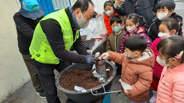 경기 광주시 행복마을관리소가 다중 이용시설의 불법 카메라 설치 여부 점검과 텃밭 가꾸기 체험을 운영하고 있다. 특히 텃밭 가꾸기 체험은 평소 환경정비로 모은 페트병과 배양토·새싹보리 등 모종을 준비해 관리소를 방문한 주민들이 직접 모종을 페트병 등에 심어서 가져갈 수 있도록 했다. 사진은 최근 관리소를 방문한 어린이들이 모종을 심고 있는 모습. (사진제공=광주시청)