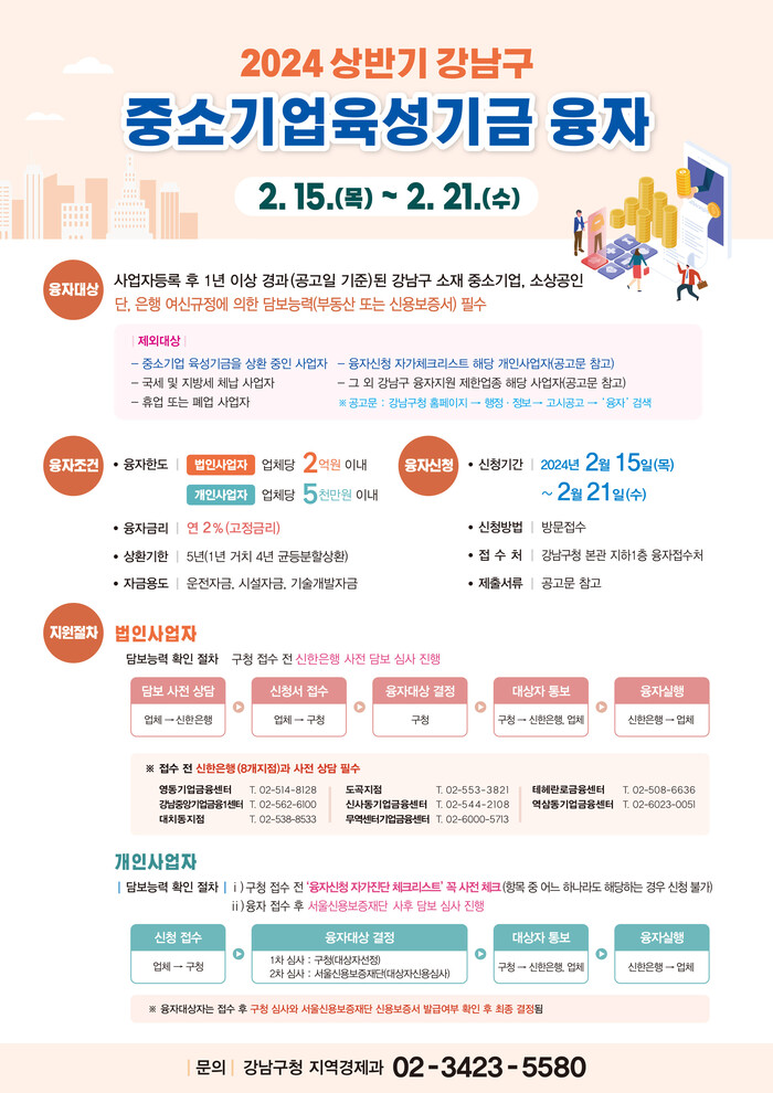 지원대상은 사업자등록 후 1년 이상이 된 강남구 소재 사업장이고, 운영·시설·기술개발에 사용하는 자금으로 융자 한도는 법인사업자 2억 원, 개인사업자 5천만 원이다. 연 2% 고정금리이며, 1년 거치 4년 균등분할상환 조건이다. 단, 현재 강남구 중소기업 육성기금을 상환 중인 사업자를 비롯해 국세·지방세 체납, 휴업 또는 폐업한 사업자, 유흥주점, 전용면적 330㎡이상 음식점, 숙박업 등 융자지원 제한업종 사업자는 제외 대상이다.