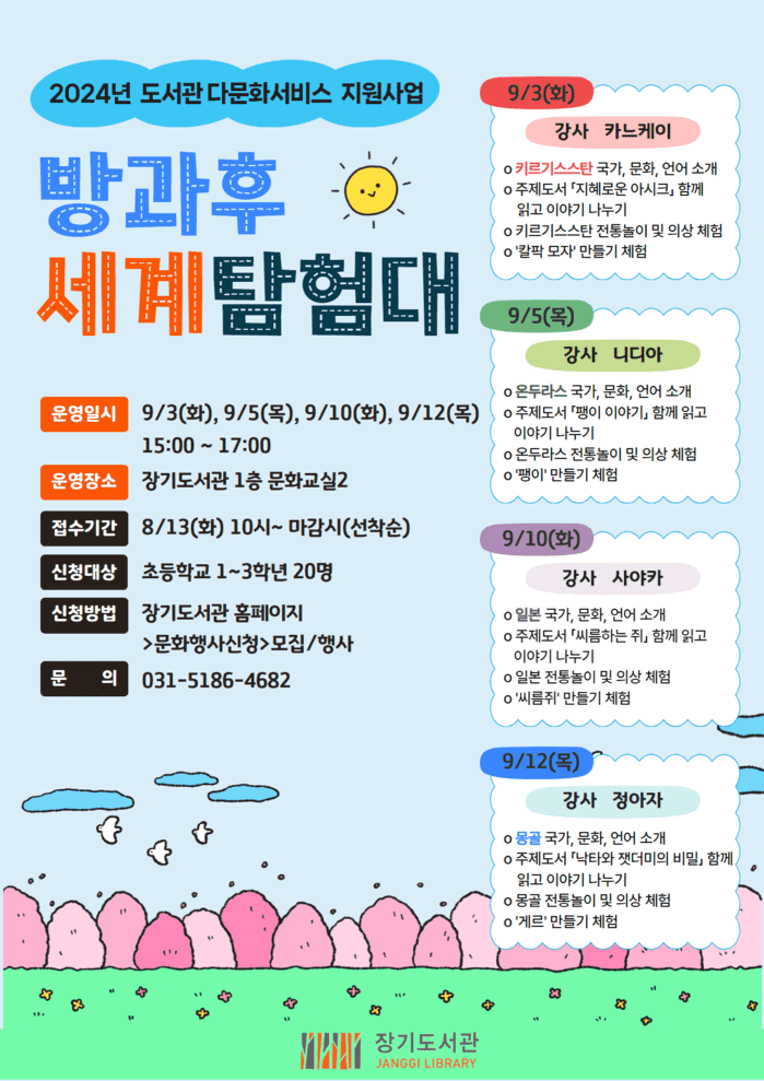 [김포=문찬식 기자] 경기 김포시 장기도서관은 오는 9월3일부터 12일까지 매주 화ㆍ목요일 오후 3시부터 5시까지 초등학생을 대상으로 ‘방과후 세계탐험대’를 운영한다.