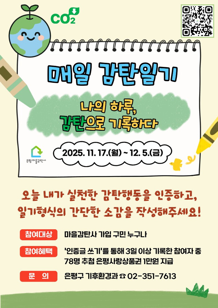 또한 ‘매일 감탄일기’ 참여자 중 일부를 추첨해 은평사랑상품권을 지급함으로써 구민들의 적극적인 참여를 독려하고 탄소중립 실천문화 확산과 기후위기 대응의 가치를 함께 나눌 계획이다.