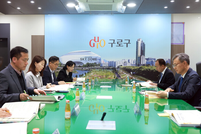 | ▲ ‘2025년도 주요업무보고회’에서 장인홍 구청장(오른쪽)이 관계자들과 회의를 진행하고 있다. (사진=구로구청 제공) |
