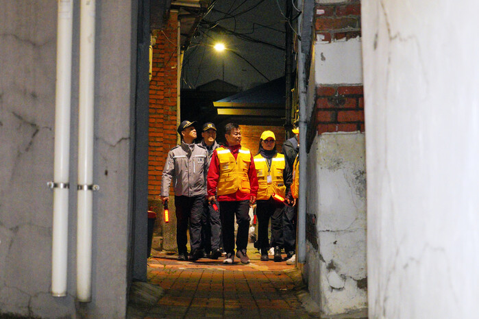 | ▲ 지난 15일 이필형 동대문구청장이 안심귀가 스카우트 대원, 동대문경찰서 관계자들과 골목길 야간 순찰을 하고 있다.(사진=동대문구청 제공) |