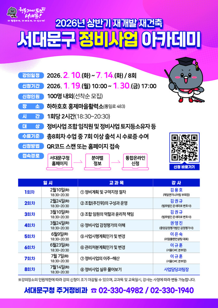 [시민일보 = 이대우 기자] 서대문구(구청장 이성헌)가 올해도 ‘재개발·재건축 정비사업 아카데미’를 오는 2월10일∼7월14일 총 8회차에 걸쳐 홍제역 인근 ‘하하호호 홍제마을활력소’(통일로 483)에서 무료로 운영한다.