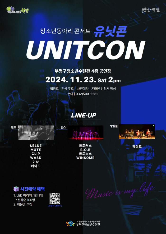 [인천=문찬식 기자] 인천 부평구 청소년수련관은 오는 23일 오후 2시 수련관 공연장에서 하반기 청소년동아리 콘서트 ‘유닛콘(UNITCON)’을 개최한다.