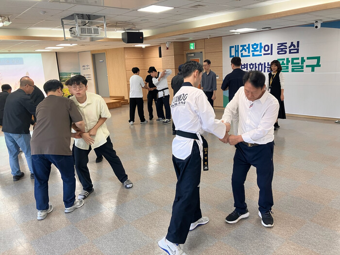 경기 수원시 팔달구는 공공청사 내 각종 폭력 및 테러에 대응하기 위해 지난 17일 SOS팔달안전봉사단과 구·동 공직자를 대상으로 구청 대회의실에서 호신술 실습 등 범죄예방 교육을 실시했다. 이번 교육은 경희대 출강 외래교수가 직접 ▲공공청사 내 범죄(테러) 이론 교육 ▲흉기 소지자, 폭력행위자 대상 호신술 실습 순서로 교육을 진행했다. 사진은 교육이 진행 중인 모습. (사진=팔달구청 제공)