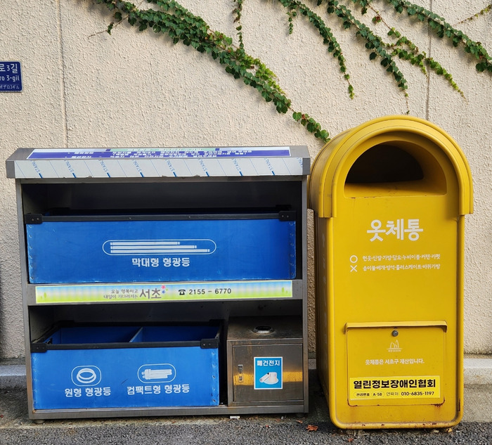 | ▲ 서초구 옷체통 및 폐형광등·폐건전지 수거함. (사진=서초구청 제공) |