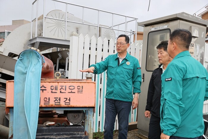 | ▲ 명현관 해남군수가 30일 상습 침수 지구인 문내면 선두리를 방문해 배수펌프장 가동 현황을 점검하고 있다. / 해남군 제공 |