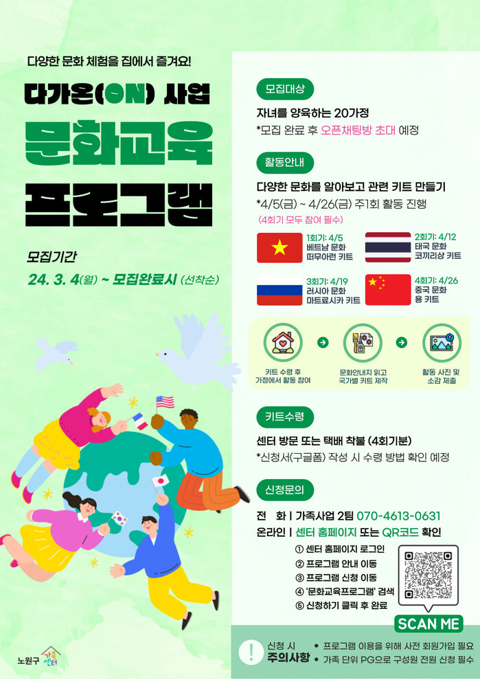 [시민일보 = 이대우 기자] 서울 노원구가족센터에서는 다문화 및 비다문화 가족을 대상으로 오는 4월 5~26일, 매주 다른 국가의 문화를 가정에서 만나볼 수 있는 ‘문화교육프로그램’을 진행할 예정이다.
