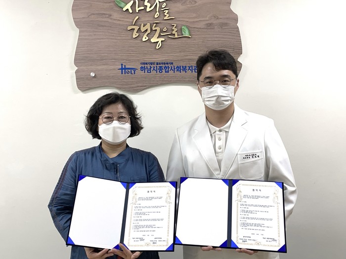 경기 하남시종합사회복지관과 올바로치과의원은 31일 지역 주민의 치아건강 증진을 위한 치과의료협약을 맺었다. 협약 후 올바로치과의원은 노인들을 대상으로 기초구강 점검과 치아 관리 교육 등 무료검진서비스를 제공했다. 사진은 협약식에서 관계자들이 기념촬영을 하는 모습. (사진제공=하남시청)