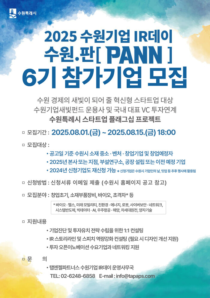 [수원=임종인 기자] 경기 수원시가 ‘2025 수원기업 IR데이 수원·판(PANN) 6기’에 참여할 기업을 오는 15일까지 모집한다.