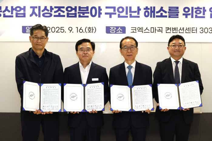 서울 강서구가 16일 고용노동부 서울남부지청, 한국항공협회, 서울지역 인적자원개발위원회와 ‘항공산업 지상조업분야 구인난 해소를 위한 업무협약’을 체결했다. 사진은 진교훈 구청장(왼쪽 두 번째)이 기념 촬영을 하는 모습. (사진=강서구청 제공)