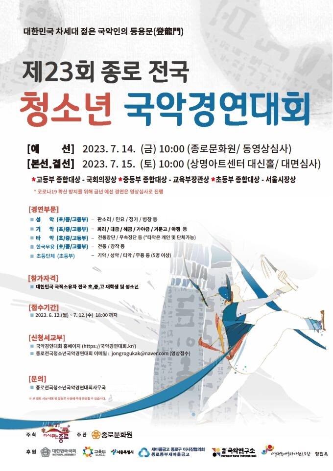 정문헌 구청장은 “국악을 사랑하는 청소년들이 아름다운 경쟁을 하며 후회 없는 무대를 보여주길 기대한다. 전통문화 종가 종로는 앞으로도 우리 고유의 문화를 잘 지키고, 차세대 국악인 발굴을 포함해 국악의 일상화를 위해 노력하겠다”고 밝혔다.