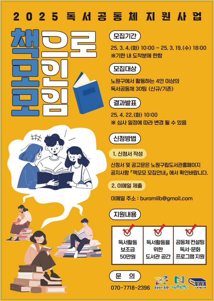 [시민일보 = 박소진 기자] 서울 노원구(구청장 오승록)가 2025년 ‘책모모’ 독서공동체 지원사업 참여자를 모집한다고 4일 밝혔다.