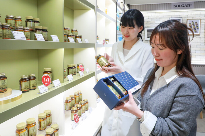 | ▲ 고객이 현대백화점 목동점 네슬레 헬스사이언스 매장에서 영양사와 함께 네슬레 헬스사이언스의 대표 건기식 브랜드 '솔가' 제품을 둘러보고 있는 모습. (사진=현대백화점 제공) |