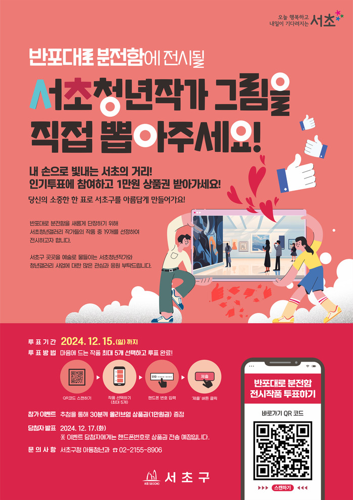 이번 투표에는 서초청년갤러리 사업 참여 작가 15명이 50개 작품을 출품했다. 투표 참여자는 50개 작품 중 최대 5개의 작품을 고를 수 있고, 최종적으로 투표 순위 1위부터 19위까지가 반포대로 분전함에 전시될 예정이다.