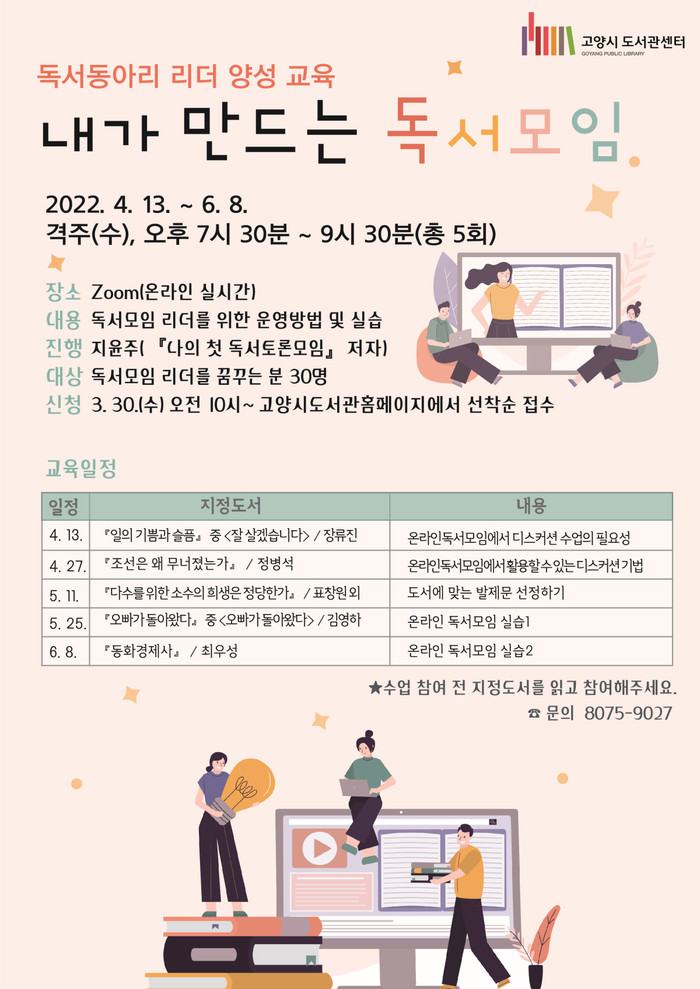 [고양=이기홍 기자] 고양시 도서관센터에서 4월 13일부터 독서동아리 리더 역량 강화를 위한 교육프로그램 '내가 만드는 독서모임'을 진행한다.