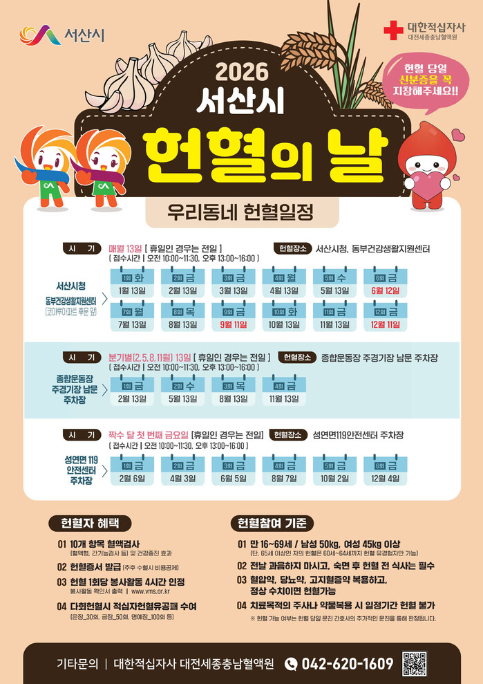 올해 헌혈의 날은 매월 13일 오전 10시부터 오후 4시까지 서산시청과 동부건강생활지원센터에서 운영된다.