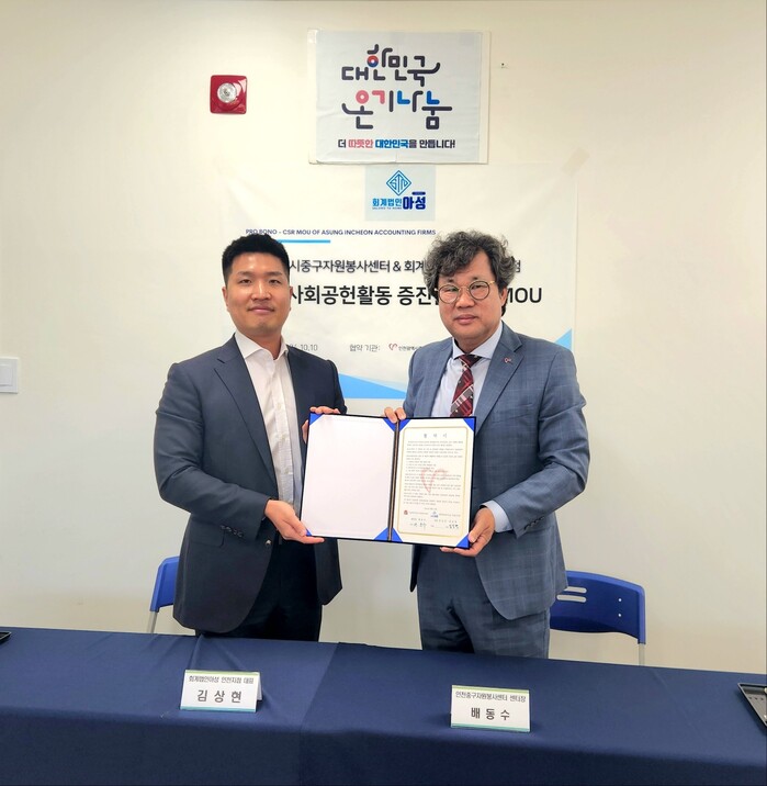 회계법인아성 인천지점 김상민ㆍ김상현 대표는 “지역주민의 생활 개선과 다양한 자원봉사를 통한 환경보호 활동을 기대한다. 인천중구자원봉사센터와 협력해 지역사회 발전을 위해 적극적으로 노력하겠다”고 강조했다.
