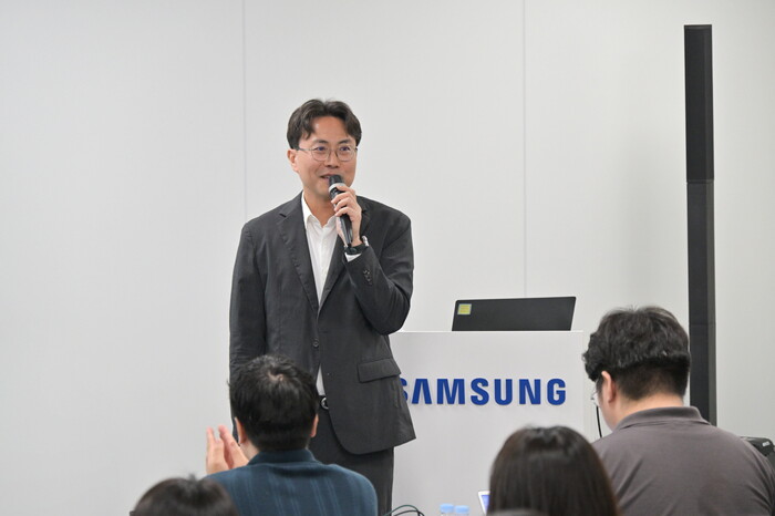 | ▲ 삼성전자 냉장고 미디어 브리핑에서 삼성전자 선행개발팀 위훈 부사장이 '비스포크 AI 하이브리드' 냉장고를 설명하고 있다. (사진=삼성전자 제공) |