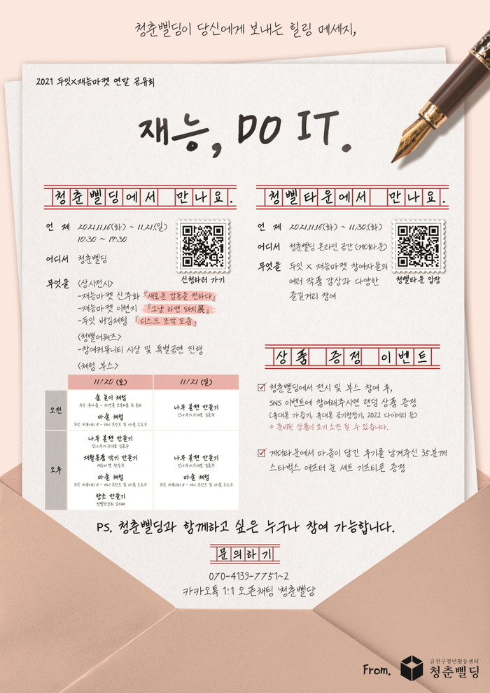 청년활동 공간 청춘삘딩이 주관하는 이번 행사는 청년커뮤니티 지원사업 ‘두잇’과 문화예술인 청년프리랜서 지원사업 ‘재능마켓’ 참여자들의 그간 활동 과정을 다양한 전시와 부스 운영을 통해 소개하고, 구민 모두 함께 즐길 수 있도록 다채롭게 꾸며진다.