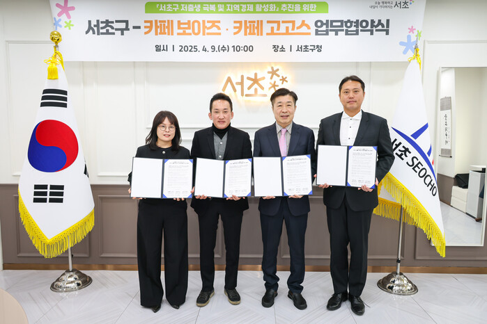 [시민일보 = 박소진 기자] 서초구(구청장 전성수)가 최근 구청에서 지역내 소상공인 업체인 카페 보아즈, 카페 고고스와 함께 ‘서초구 저출생 극복 및 지역경제 활성화’ 추진을 위한 업무협약(MOU)을 체결했다고 10일 밝혔다.