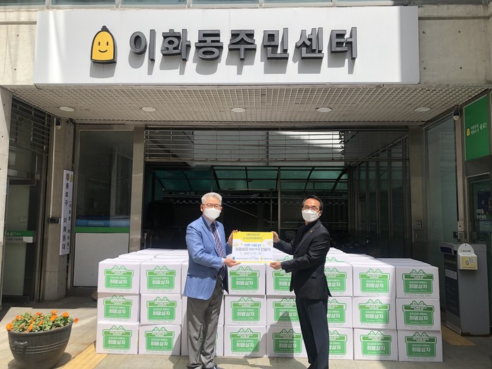 종로구 이화동이 최근 주민센터 앞마당에서 '따뜻한 마음을 담은 희망상자 나눔' 행사를 진행했다. 희망상자는 간편식과 생필품으로 구성한 10만원 상당의 물품이 담겨있으며 총 100박스가 제작됐다. 사진은 전달 후 기념촬영을 하고 있는 관계자들의 모습. (사진제공=종로구청)